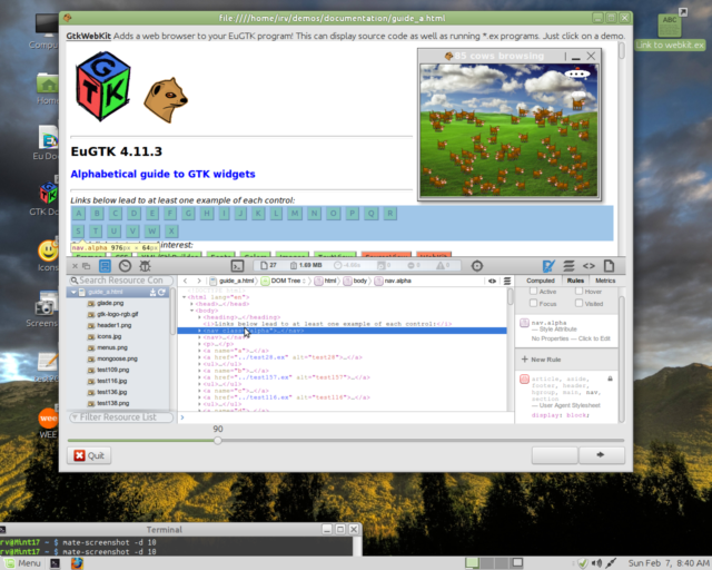 Also, there's a plug-in for LibWebKit, which adds a web browser 'widget' to EuGTK. This includes a pop-up 'inspector', which works very nicely.